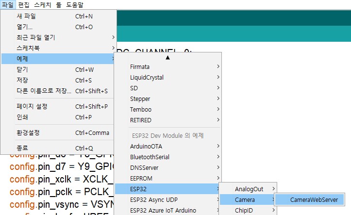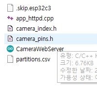 그리고 camera_pins.h를 가져와야 됩니다. 이건 파일 -> 예제 -> esp32 -> camera ->cameraWebserver