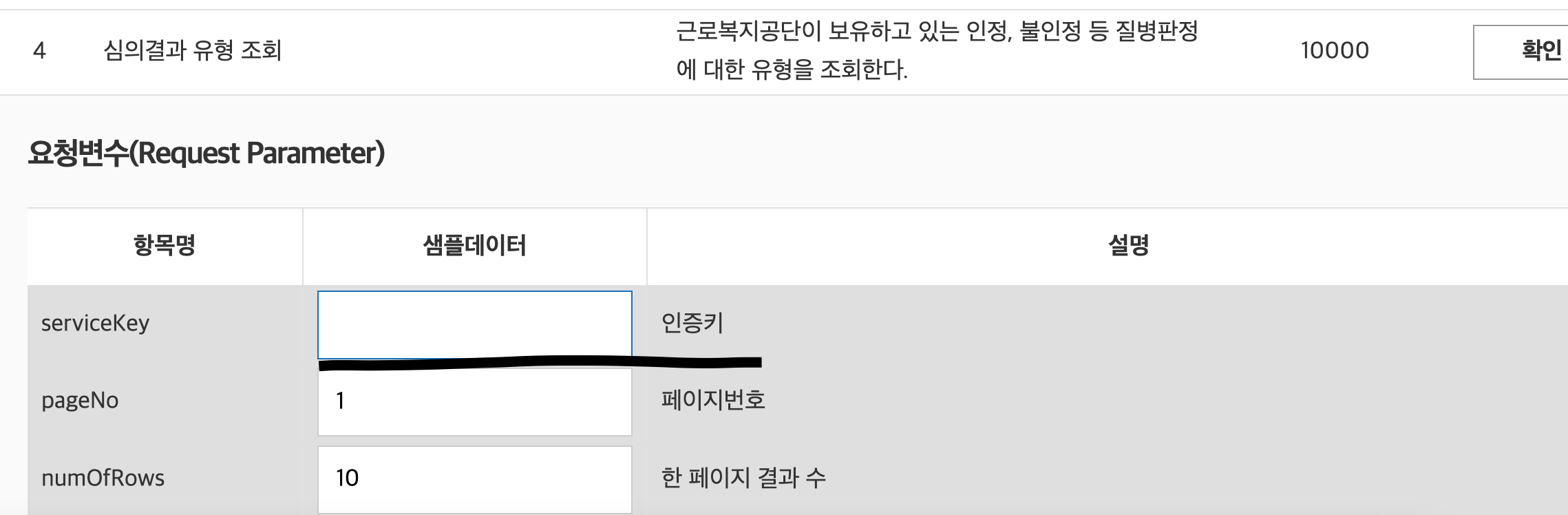 저는 근로복지공단_질병판정서 조회 서비스 데이터를 가지고 파싱을 해보겠습니다.