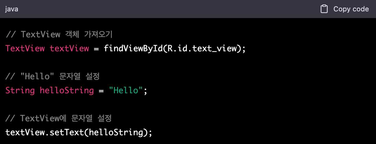 이렇게 작성 줘야 됩니다. TextView 뿐만 아니라 다른 위젯들도 마찬가지입니다. 먼저 xml파일에서 해당 위젯 코드를 입력한 다음 id를 설정하고 또 그걸 자바파일로 넘어가서 findviewById로 가져온 다음 관련 메서드를 써서 설정을 해줘야 됩니다.